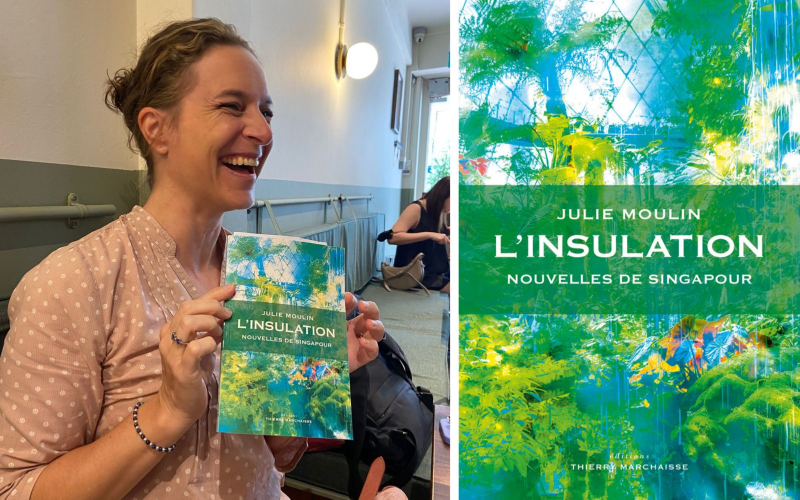 À gauche : l'auteure Julie Moulin en décembre 2025. À droite : couverture du livre L'Insulation, Nouvelles de Singapour. Crédit : Capucine Canonne